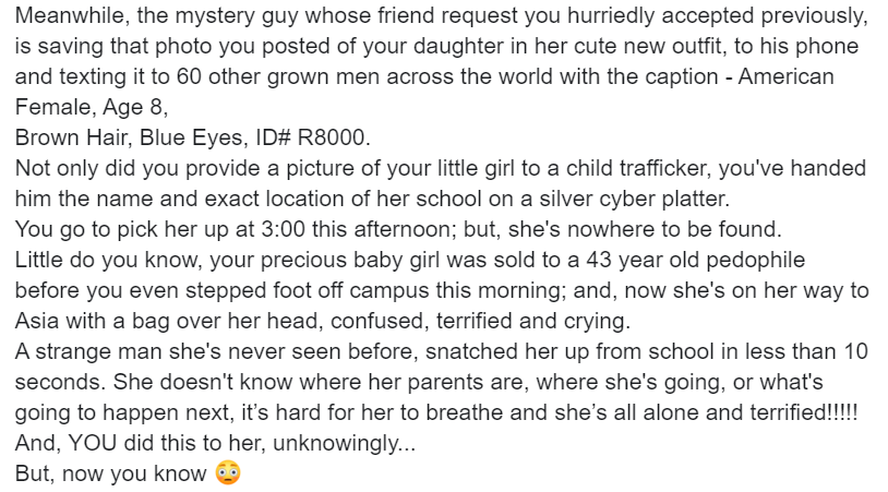 This part I agree with for the most part. While I don’t think your kids will be whisked away and shipped off to Thailand, that doesn’t mean that predators and traffickers won’t approach your kids on social media. And by posting every detail of their lives on Facebook, it gives the predators and traffickers more ammunition in their arsenal to groom your children.