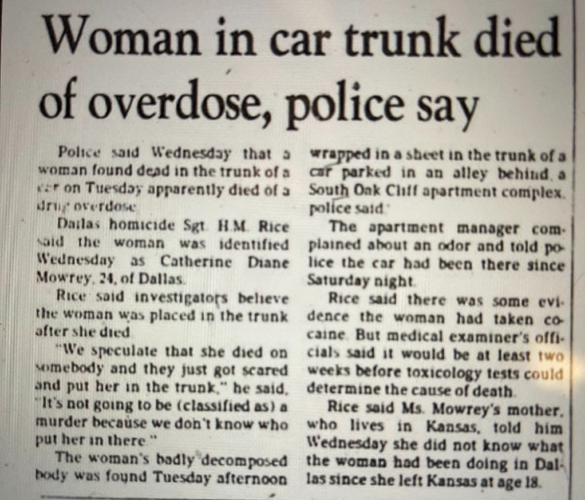 Catherine ‘Catrina’ Diane Mowrey was 18-years-old when she and her sister Jo Ann left their family’s Kansas home for Dallas, Texas in 1979. Sadly, on June 25, 1985, Catrina’s body was found in the trunk of a Ford LTD that had been parked in an alley. Dallas police had been notified by a nearby apartment manager that an odor was emanating from the car. When police approached the car, they had noticed an abundance of flies in and out of the car. Police pried the trunk open, where they found Catrina’s body wrapped in a stained sheet. At the time, police believed Catrina died of a drug overdose, and her body was put in the car after her death.